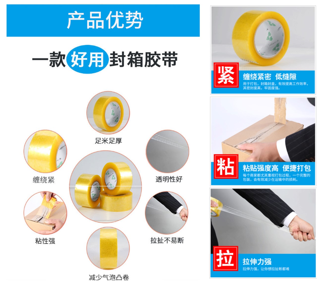 封箱膠帶(dài)又稱之為bopp膠帶、包裝(zhuāng)膠帶等,它是以BOPP雙向拉伸聚丙烯薄膜為基材(cái),經過加溫均勻塗(tú)抹壓(yā)敏膠乳液,使(shǐ)其形成8μm----28μm不等的膠層(céng),是輕工(gōng)業類企業、公司、個人生活中不可缺少的用品(pǐn)雙為基材(cái)壓,封箱膠粘(zhān)帶側重粘性及抗強度,氣候適應力強,具有高抗張力,膠(jiāo)水性能(néng)穩定。