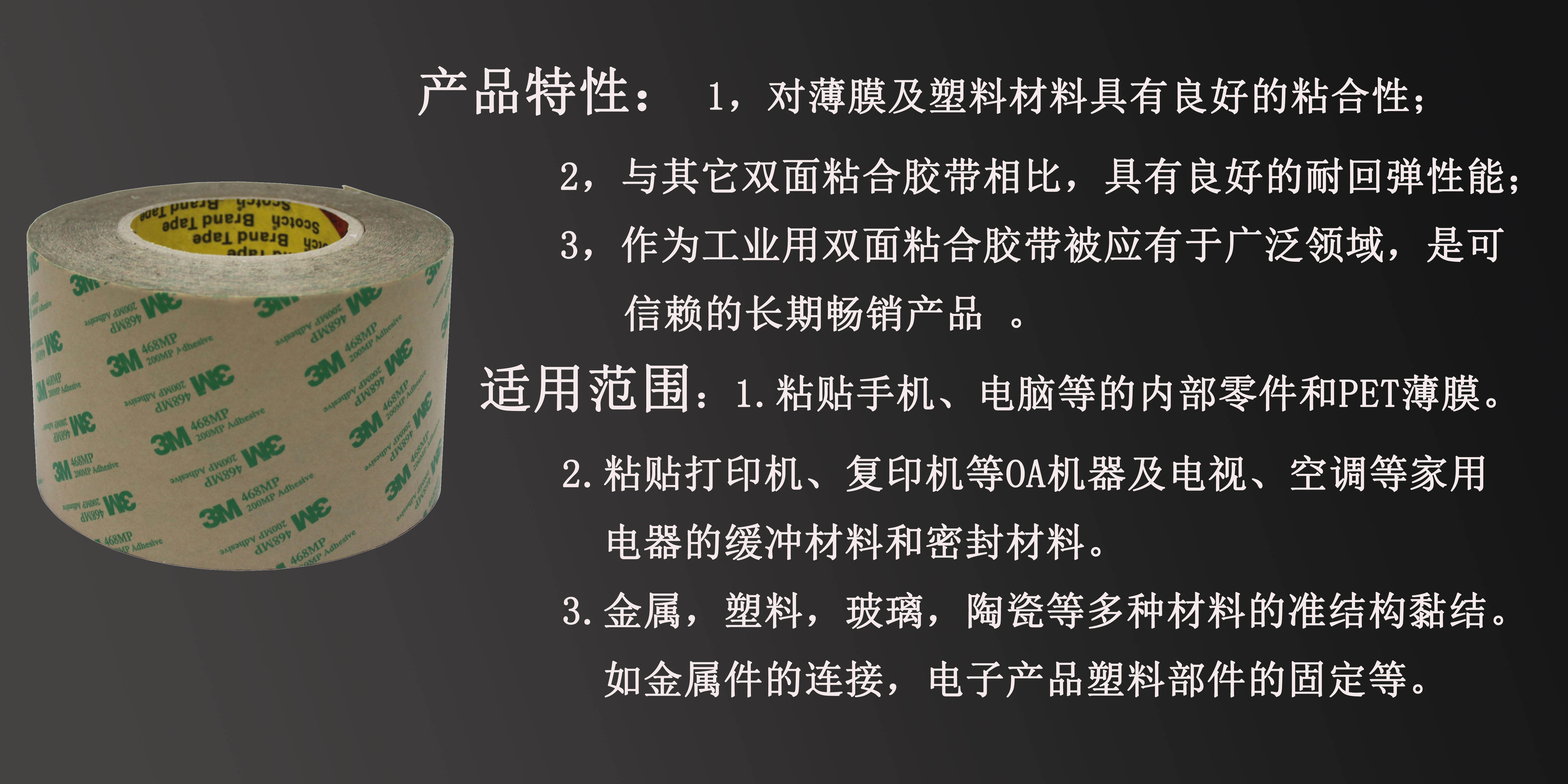 3M468雙麵膠帶直接由丙希酸膠塗布壓製而(ér)成,膠帶顏(yán)色為透明,常見厚度規格為:0.06-0.13MM,具(jù)有優良的粘(zhān)合效果,能(néng)防止脫落與優異的防水性能,加工性好、耐溫性好,尺寸穩定性、熱穩定性、化學穩(wěn)定性(xìng)好,初粘性和持粘性好;能(néng)適用於更寬(kuān)的(de)溫度範圍和惡劣環境;長期耐溫80-95℃,短期耐溫可達180-205℃;