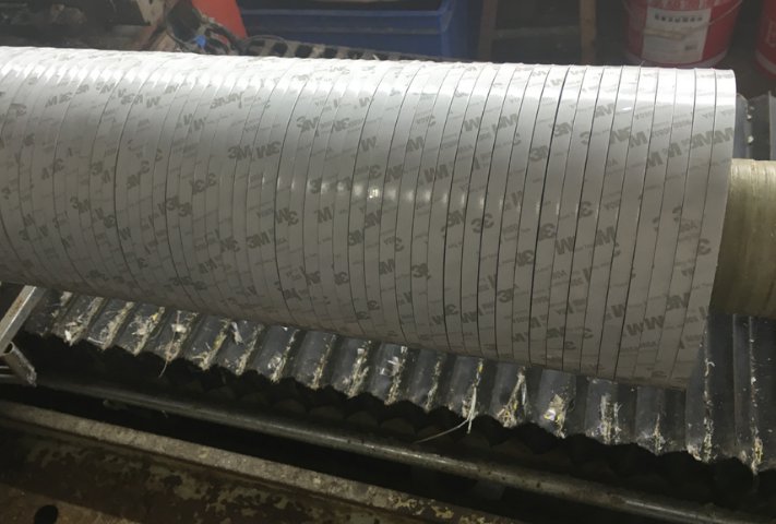 2、待清潔溶劑幹燥後,將膠帶貼合於粘著表麵,以滾筒或其他方式施以約15PSI(1.05公斤/平方厘米)之壓力,使其有效粘合。
