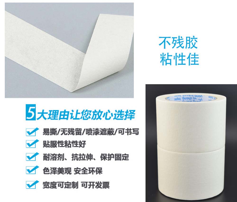美紋紙膠帶是以美紋(wén)紙和壓敏(mǐn)膠(jiāo)水為主要原料,在美紋紙上塗覆壓敏膠粘劑,另(lìng)一麵塗以防粘(zhān)材料而製成的卷狀膠粘帶。具有耐(nài)高溫、抗化學溶劑佳、高粘(zhān)著力、柔軟服貼(tiē)和(hé)再(zài)撕不留殘膠(jiāo)等特性。行業通(tōng)稱美紋紙壓(yā)敏膠粘(zhān)帶。產品符合ROHS環保要求。英文名MASKING TAPE。