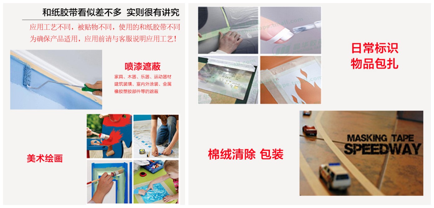 和紙膠帶以和紙為基材,紙質柔和,適合各種家具、運動器材、橡膠、塑(sù)膠部件(jiàn)及建築工地(dì)、室內、室外裝潢、裝修噴漆、刷漆時遮蔽保(bǎo)護等.