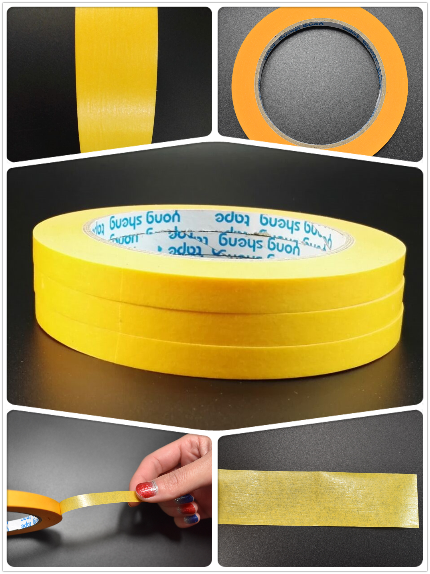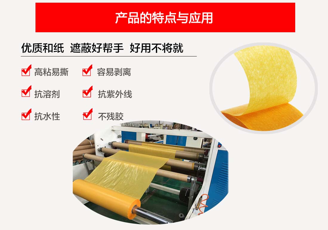 · 粘性適中,對於特別是平滑表麵,彎曲表麵和轉角處有很好的貼附性及遮蔽性,作業性良(liáng)好,使用後快速撕除不留殘膠.