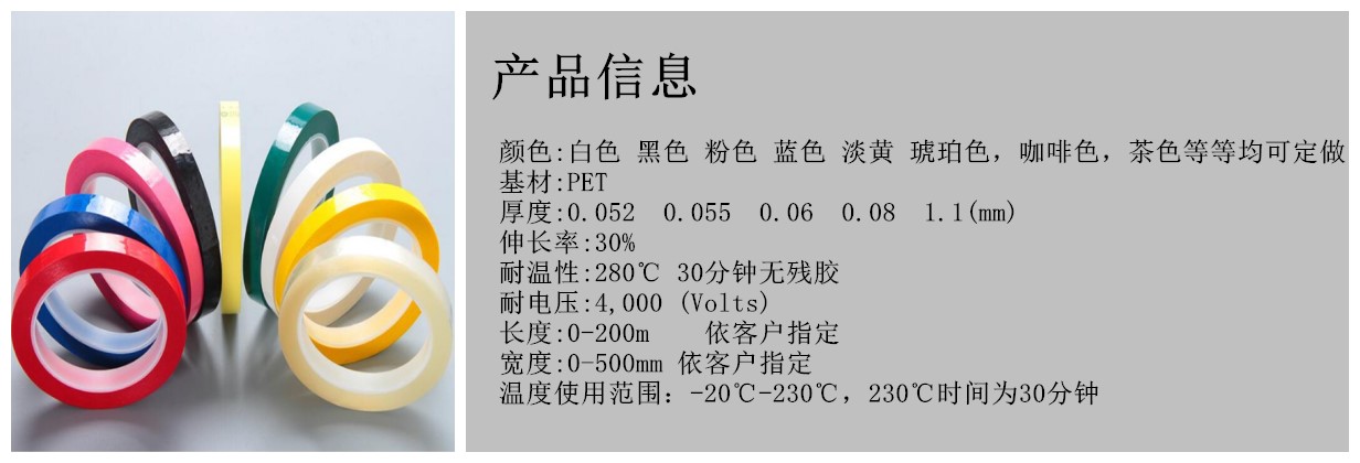 瑪拉膠帶以聚酯薄膜作為基(jī)材,采用丙烯酸阻燃膠作為(wéi)膠粘劑。該產品從形性高,有極佳的抗化學品,抗化劑和防潮的能力並可抵擋切割和(hé)磨損。