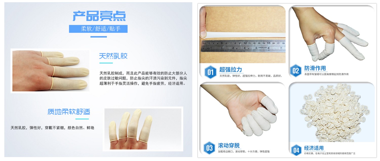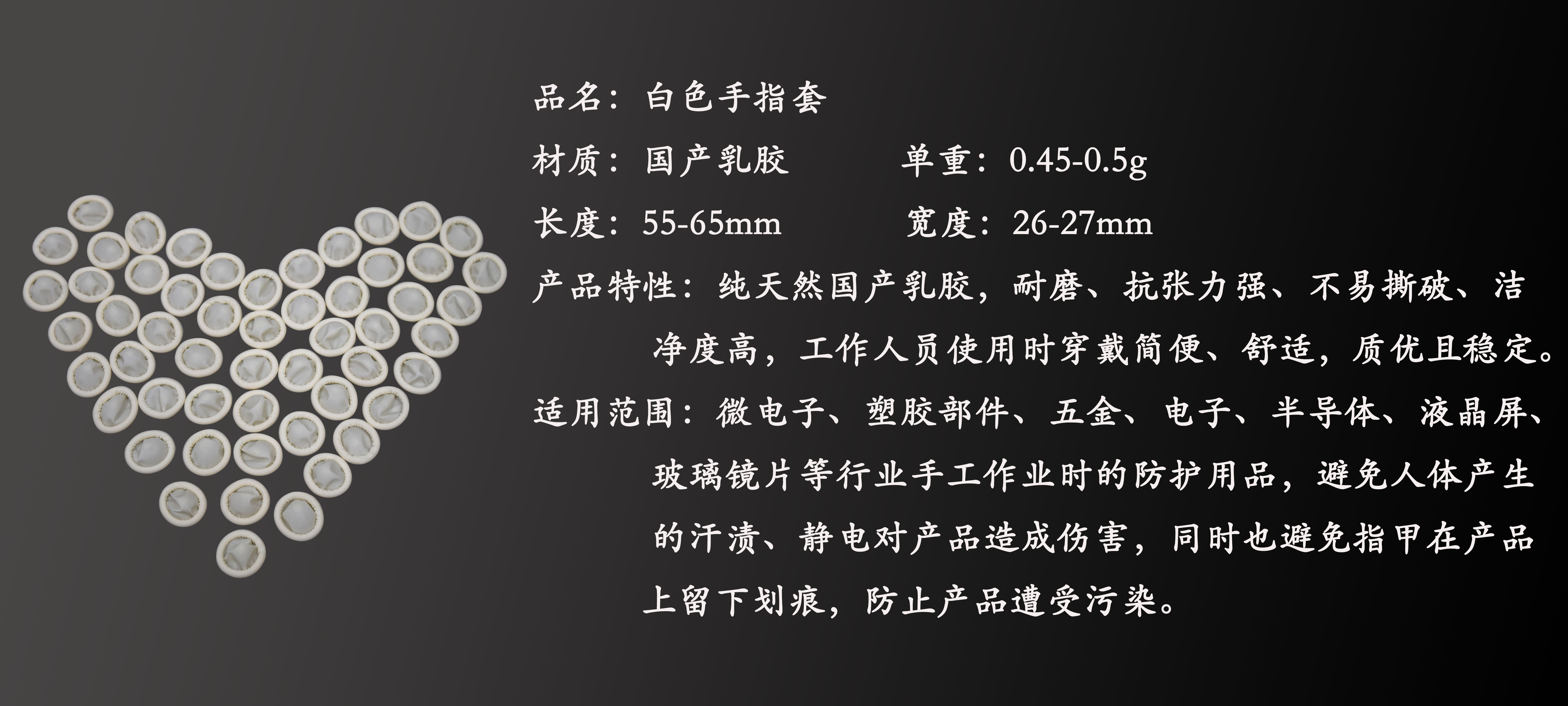 手指套一般分白色、黑色、粉紅色、米黃色,其中米黃色較為(wéi)常用。本公司手指(zhǐ)套由純天然乳膠和防靜(jìng)電材料混製而成,不含矽油、胺化物。主要應用於微電子(zǐ)、計算機、通信、半導體組裝。精密(mì)元件及生物醫藥、化(huà)工、無塵潔淨室、電子(zǐ)產品組裝等(děng)領域。