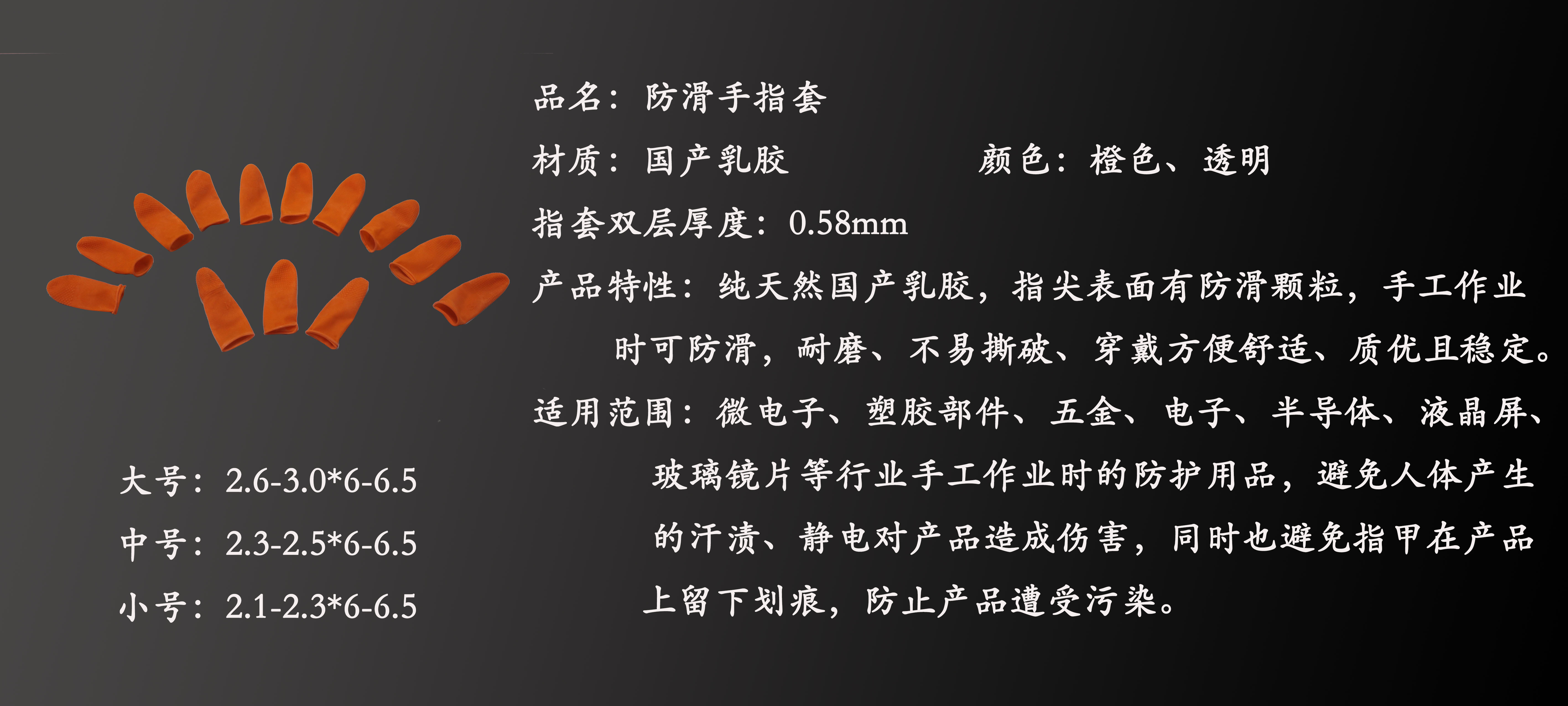 手指(zhǐ)套一般(bān)分白色、黑色、粉紅色、米黃色,其中米(mǐ)黃色較為常用。本公司(sī)手指套由純天然乳膠和(hé)防靜電材料混製而成,不(bú)含矽油、胺化物。主要應用於微電子(zǐ)、計算機、通信、半導體組裝(zhuāng)。精密元件及生物醫藥、化工(gōng)、無塵潔(jié)淨室、電子產品組裝等領域。