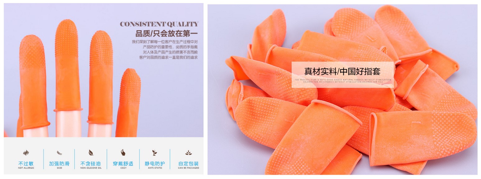 手指套一(yī)般分白色、黑色、粉紅色、米黃色,其中米黃(huáng)色較為常用。本公(gōng)司手指套由純天然乳(rǔ)膠和防靜電材(cái)料混製而成(chéng),不含矽油、胺化(huà)物。主要(yào)應用於微(wēi)電(diàn)子、計(jì)算機、通(tōng)信、半導體組裝。精密元件及生物醫藥、化工、無塵潔淨室、電子產品組裝等(děng)領域。