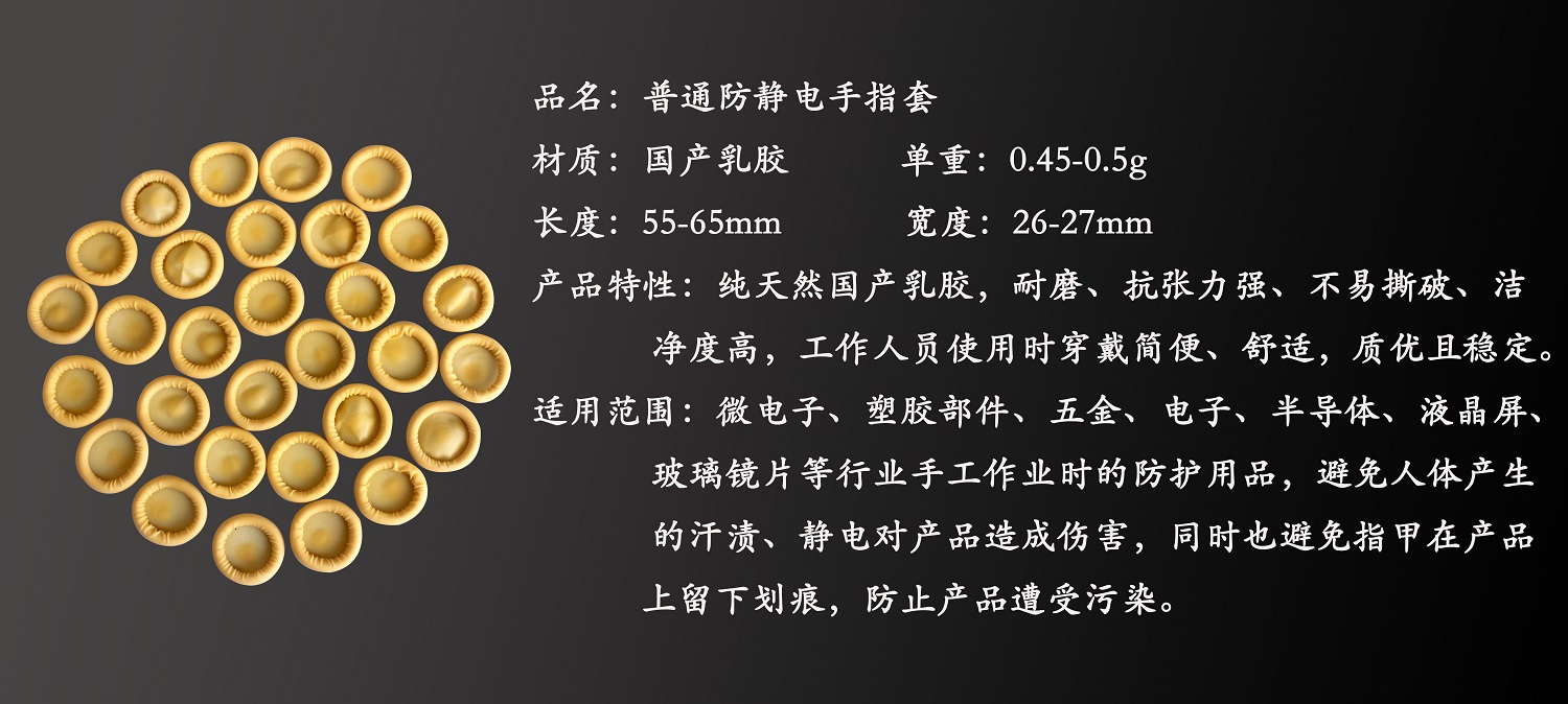 本公司手指套由純(chún)天然乳膠和防靜電材料混製(zhì)而成,不含矽油、胺化物(wù)。主要應用於微電子、計算機、通信、半導體組裝;精(jīng)密元件(jiàn)及生物醫藥、化工、無塵潔淨室、電子產品組裝等領域。