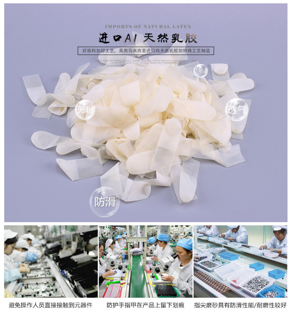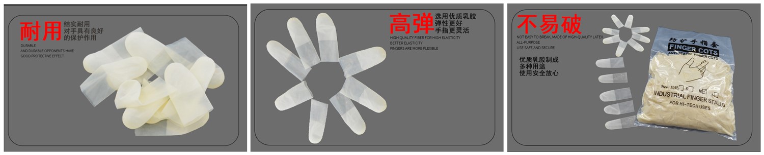 手指套一般分白色、黑色、粉紅色、米黃色,其中米黃色較為常用。本公司手指套由純天然乳膠和防靜電材料混製而成,不含矽油、胺化物。主要應用(yòng)於微(wēi)電子、計算機、通信、半導體組裝。精密元件及生物醫藥、化工、無塵(chén)潔淨室、電子產品組裝等領域。