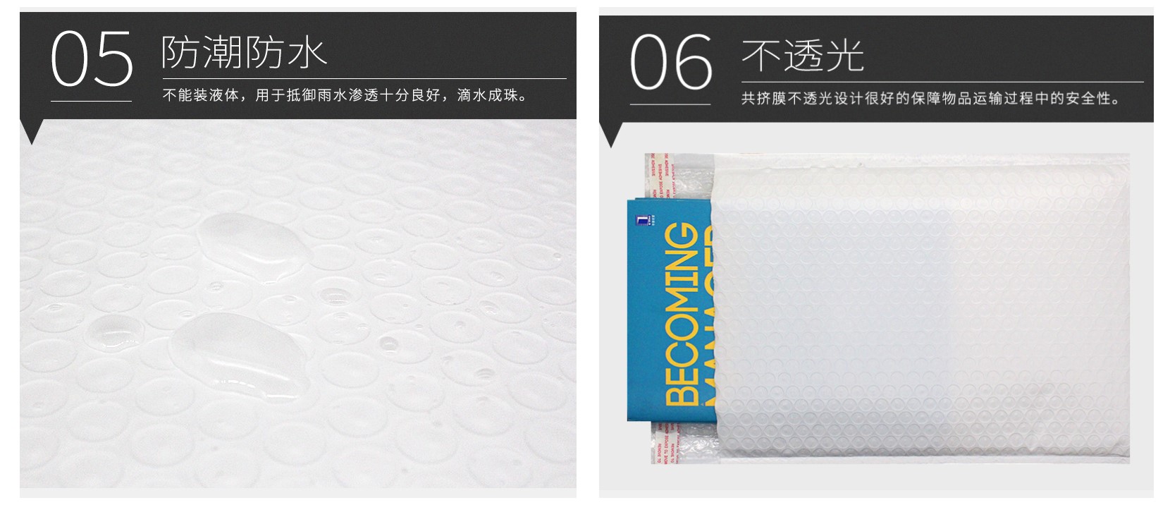 廣泛用於(yú)電子(zǐ)、儀表、陶瓷、工藝品、家用電器,自車行,廚房、家具、五金(jīn)工具製品、玻璃製品及精密儀器等的抗震性緩衝、保護包裝。可以防止在傳遞過程中對物品(pǐn)的擠壓、震動及(jí)摩擦等,對怕擠怕壓物(wù)品具有一定的保護作用。此外,通過在原料中加入不同的添加劑還可以製造(zào)防靜電等各種專用氣泡(pào)袋。防靜電(diàn)氣墊袋,用於(yú)包裝電子元(yuán)件、組件,如(rú)集成電路(lù)板、卡(kǎ)等(děng),既能防止靜電又能起到(dào)緩衝防震的作(zuò)用。