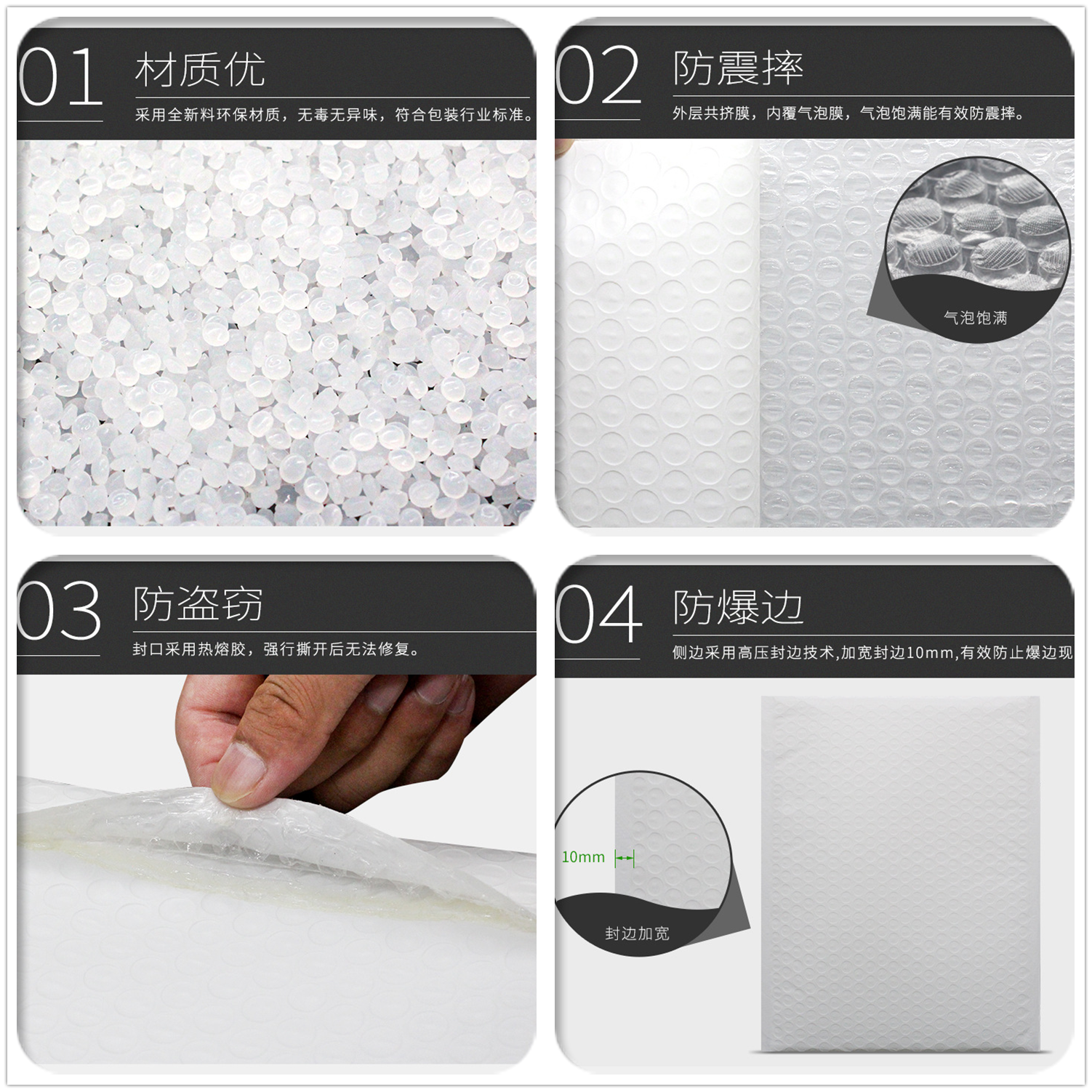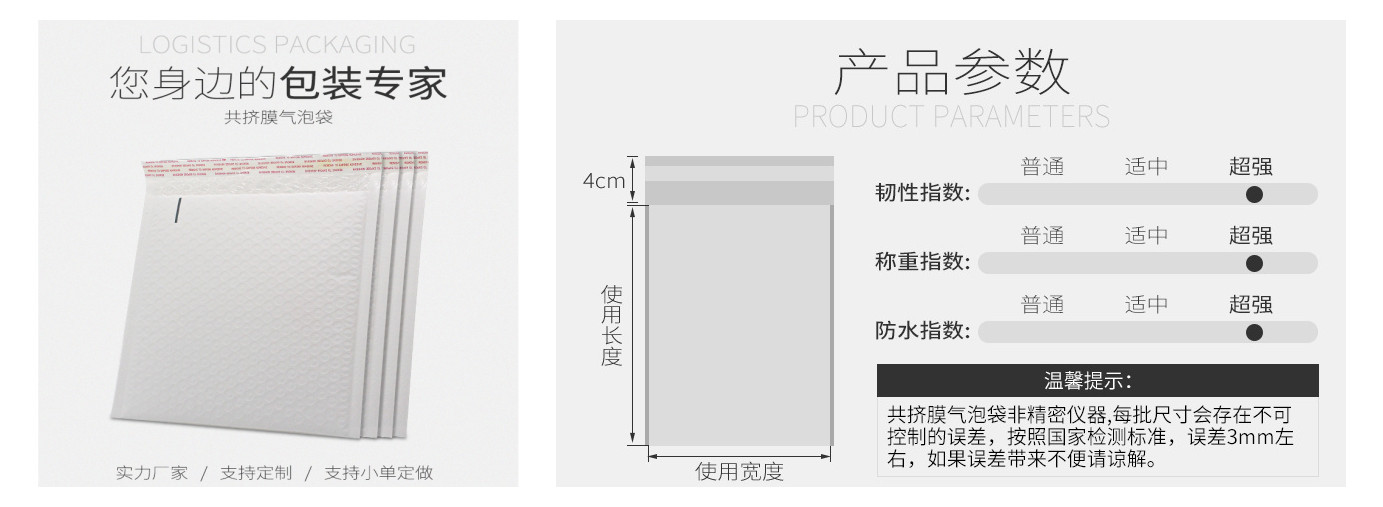 廣泛(fàn)用於電子、儀表、陶瓷、工藝品、家用電器,自車行,廚房、家具、五金工具製品(pǐn)、玻璃製品及精密儀器等(děng)的抗(kàng)震性緩衝、保護包裝。可以防止在傳遞過程中對(duì)物品(pǐn)的擠壓、震動(dòng)及摩擦等,對怕擠怕壓物品具有一定的保護作用。此外,通過在原料中加入不同的添加劑(jì)還可以製造防靜電等各種專用(yòng)氣泡袋。防靜電氣墊袋,用於包裝電子(zǐ)元件、組(zǔ)件(jiàn),如集成電(diàn)路板、卡等(děng),既能防(fáng)止靜電又能起到緩衝防震的作用。
