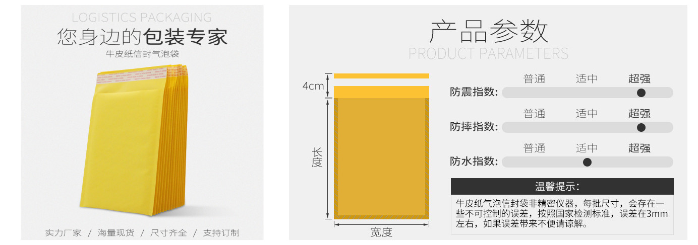 氣泡袋主要使用高壓聚乙烯氣泡膜經過切(qiē)膜加工,把氣泡(pào)膜切成需要製袋規格尺寸,然後通過氣泡(pào)膜專用製袋機{熱烘熱(rè)切製袋機}進行袋子的製作加工,主要運用於電子產品緩衝包裝(zhuāng),塑料製品,金(jīn)屬製品,陶瓷製(zhì)品,玻璃製(zhì)品以及需要緩衝保護的 其他產(chǎn)品的 物流運輸保護。氣泡膜使用高壓低密度聚乙烯加工而成(chéng),是當前普遍使用的一種透明軟包裝材料,用途廣泛。