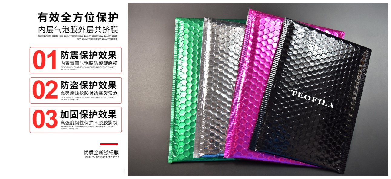 氣泡袋主要使用高壓聚乙烯氣泡膜經過切膜加工,把氣泡膜切成需(xū)要製袋規格尺寸,然後(hòu)通過氣泡(pào)膜專用(yòng)製袋機{熱烘熱切製袋機}進行袋子的製作(zuò)加工,主要(yào)運用於電子產品緩衝包裝,塑料製品,金屬製品,陶瓷製品,玻璃製品以及需要緩衝保護的 其他產品的 物流運輸(shū)保護。氣(qì)泡膜使用高壓低密(mì)度聚乙烯(xī)加工而成,是當前普遍使用的一種透明軟包裝材料,用途廣泛。