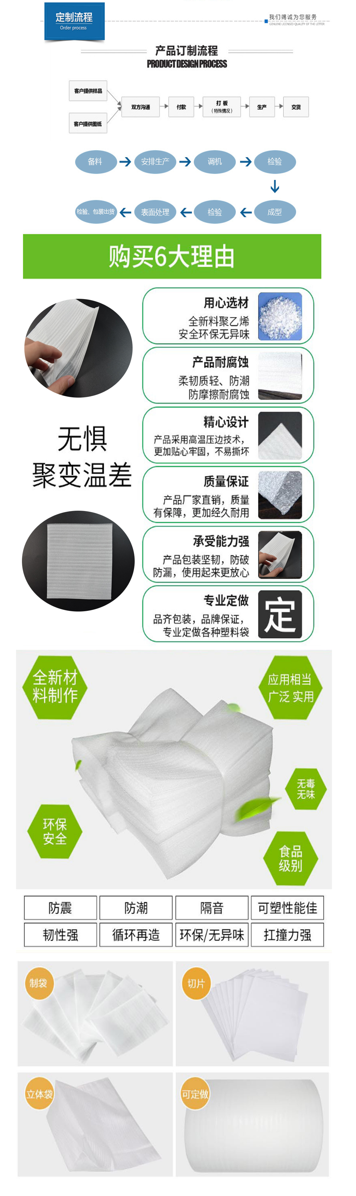 PP/PE/OPP/PVC/CPE膠(jiāo)袋、複合膠(jiāo)袋、磨砂袋、自粘袋、卡通袋、紐扣袋、異型袋、掛鉤袋、垃圾袋、屏蔽袋、骨口袋(dài)、自封袋、拉(lā)鏈袋、印刷袋、卡頭袋、鋁箔袋、氣(qì)泡袋、珍珠棉袋、珍珠棉片、化妝(zhuāng)品袋、生物降解袋、手挽袋、防靜電膠袋等(děng)。