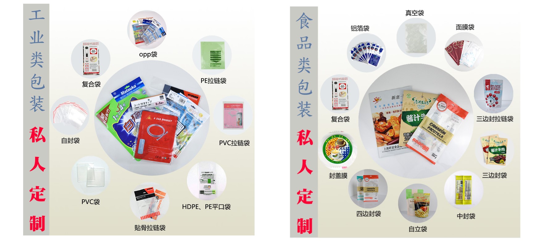 PP/PE/OPP/PVC/CPE膠(jiāo)袋、複合膠袋、磨砂袋、自粘袋、卡通袋、紐扣(kòu)袋、異型袋、掛鉤袋、垃圾(jī)袋、屏蔽袋(dài)、骨口袋、自封袋、拉鏈袋、印刷袋、卡(kǎ)頭袋、鋁箔袋(dài)、氣泡袋、珍珠棉袋、化妝品袋、生物降解袋、手挽袋、防靜電膠袋等。