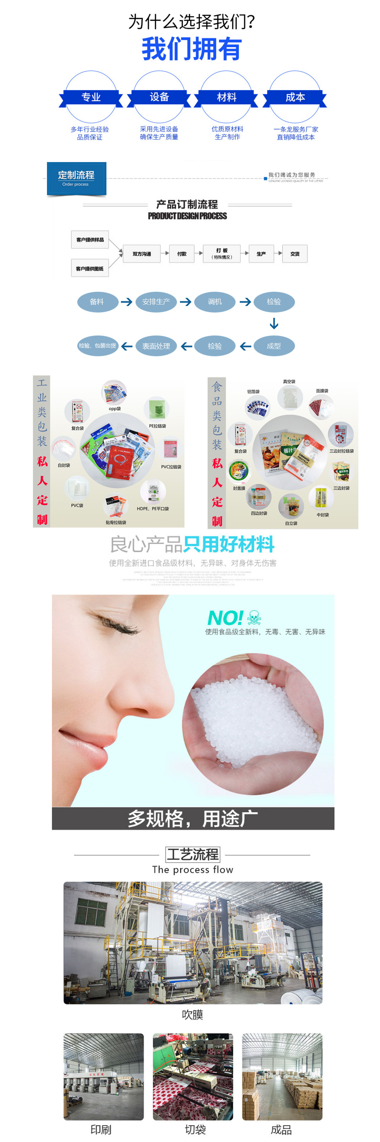 PP/PE/OPP/PVC/CPE膠袋、複合膠袋、磨砂袋、自粘袋、卡通袋(dài)、紐扣袋、異型袋、掛鉤袋、垃圾袋、屏蔽袋、骨口袋(dài)、自封袋、拉鏈(liàn)袋、印刷袋、卡頭袋、鋁箔袋、氣泡袋、珍珠棉袋、化妝品袋、生物降(jiàng)解袋、手挽袋、防靜電膠袋等。